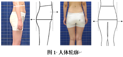 在进行裙装原型制作时,裙身的尺寸往往是以人体臀围作为一个参考标准进行加放处理。但裙身所需最大围度长并不能简单的视为人体臀围净尺寸。观察人体体型会发现,侧面(图1-左)的腹部前突和后臀突为前面和后面最突出的位置;体侧(图1-右)最突出位置也因人而异,在人体体型测量统计获取的数据中发现,体侧突出位并未落在臀围线上,73%被测者的体侧最突出点是落在臀围线下方的侧胯突位。