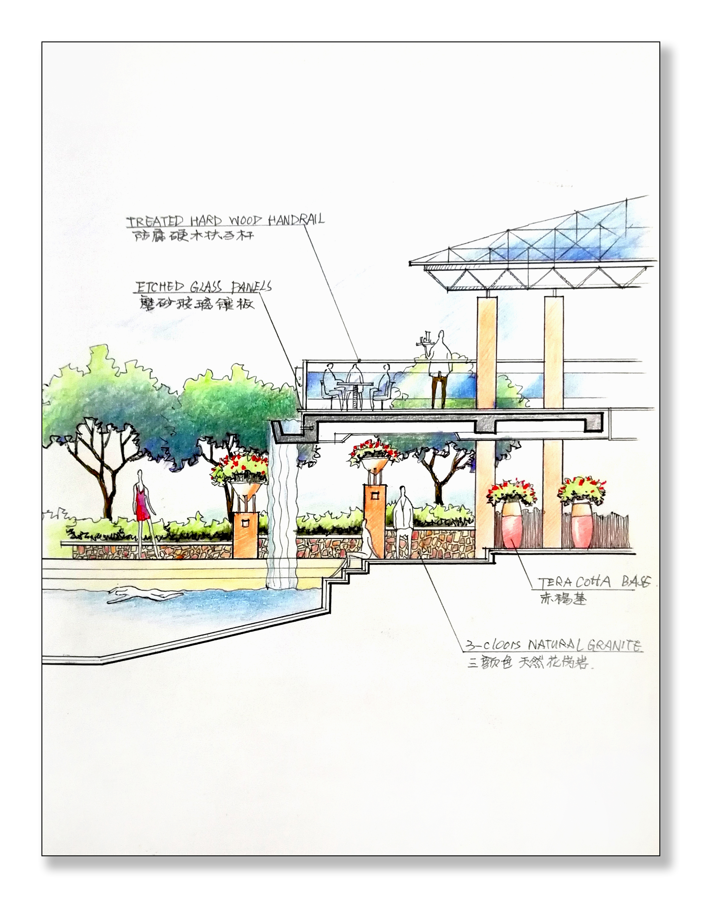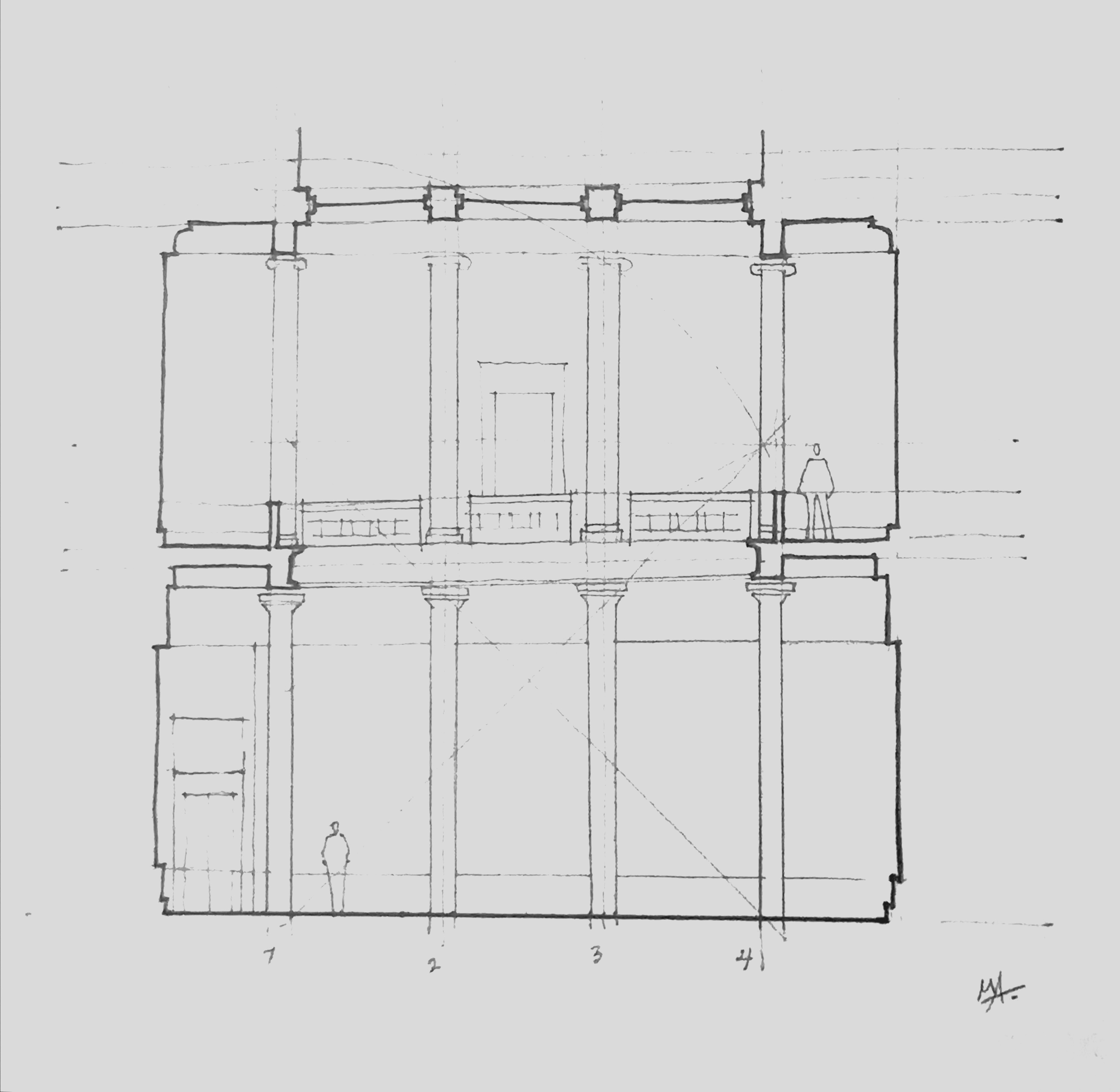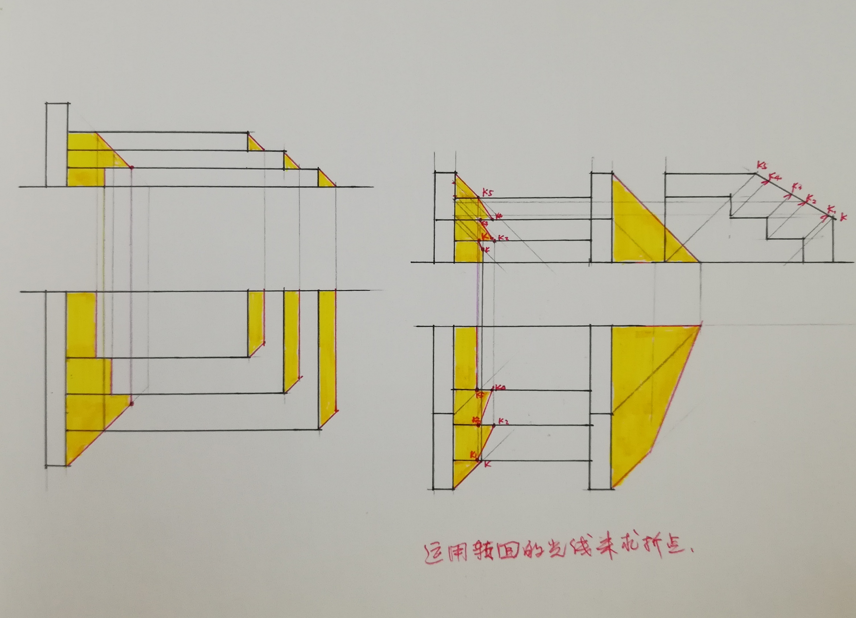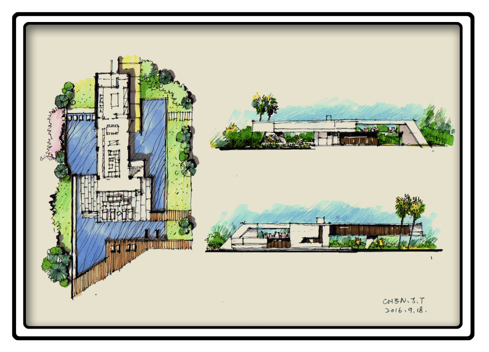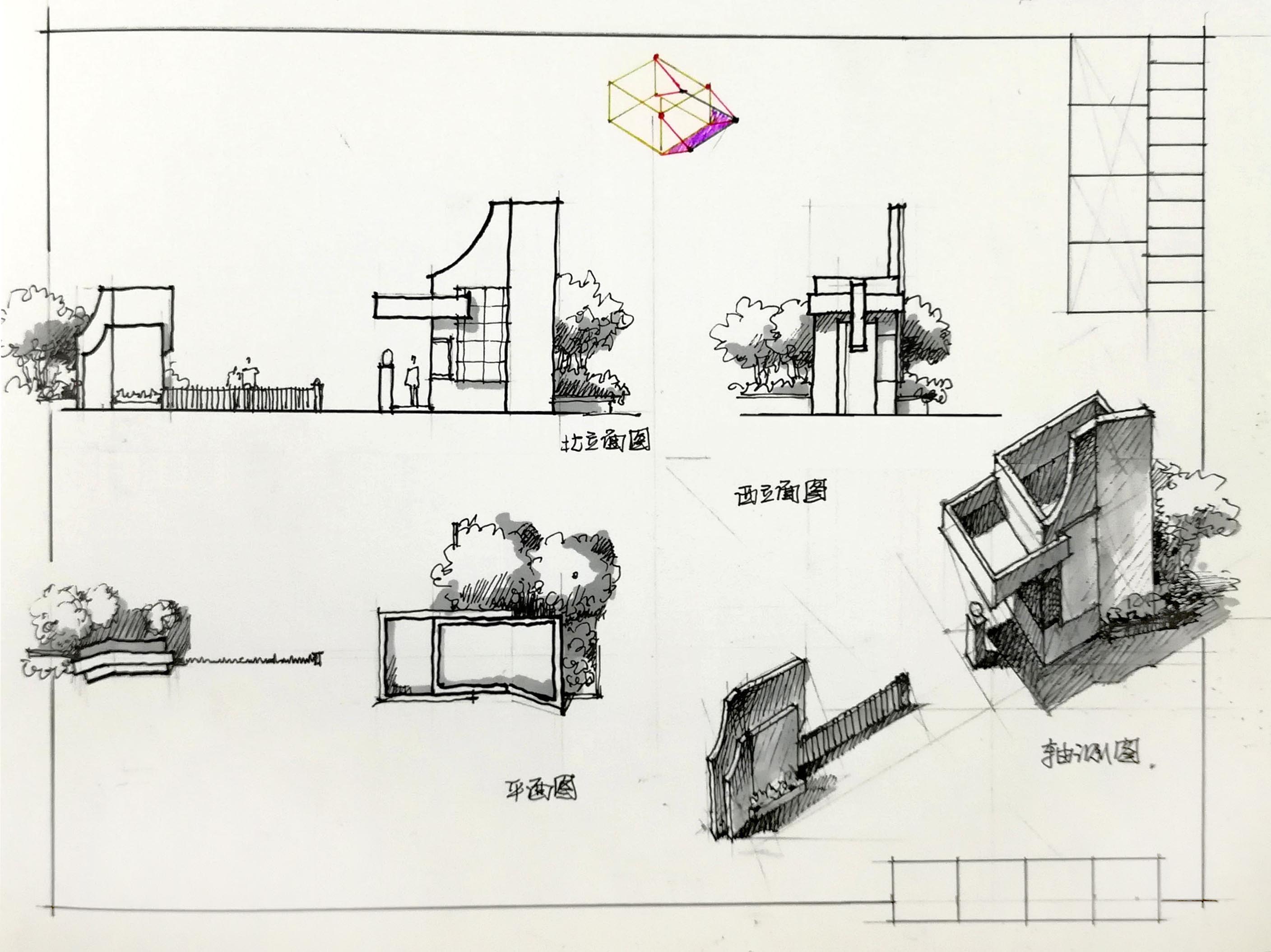 而在进行正投影图的绘制时,要培养从整体到局部的控制能力。不仅哲学中有范学的概念,设计实践中在空间处理方面也有一个类似的次关系。正投影图的内容设计应该与图纸的大小及比例尺的设定相統一。在快速念记录和概念表达阶段,平立剖图的比例尺度在精度上要求不会太高。但是,一旦到了设计深化以及重要的节点表达时,平立剖图的精度求会加强许多。