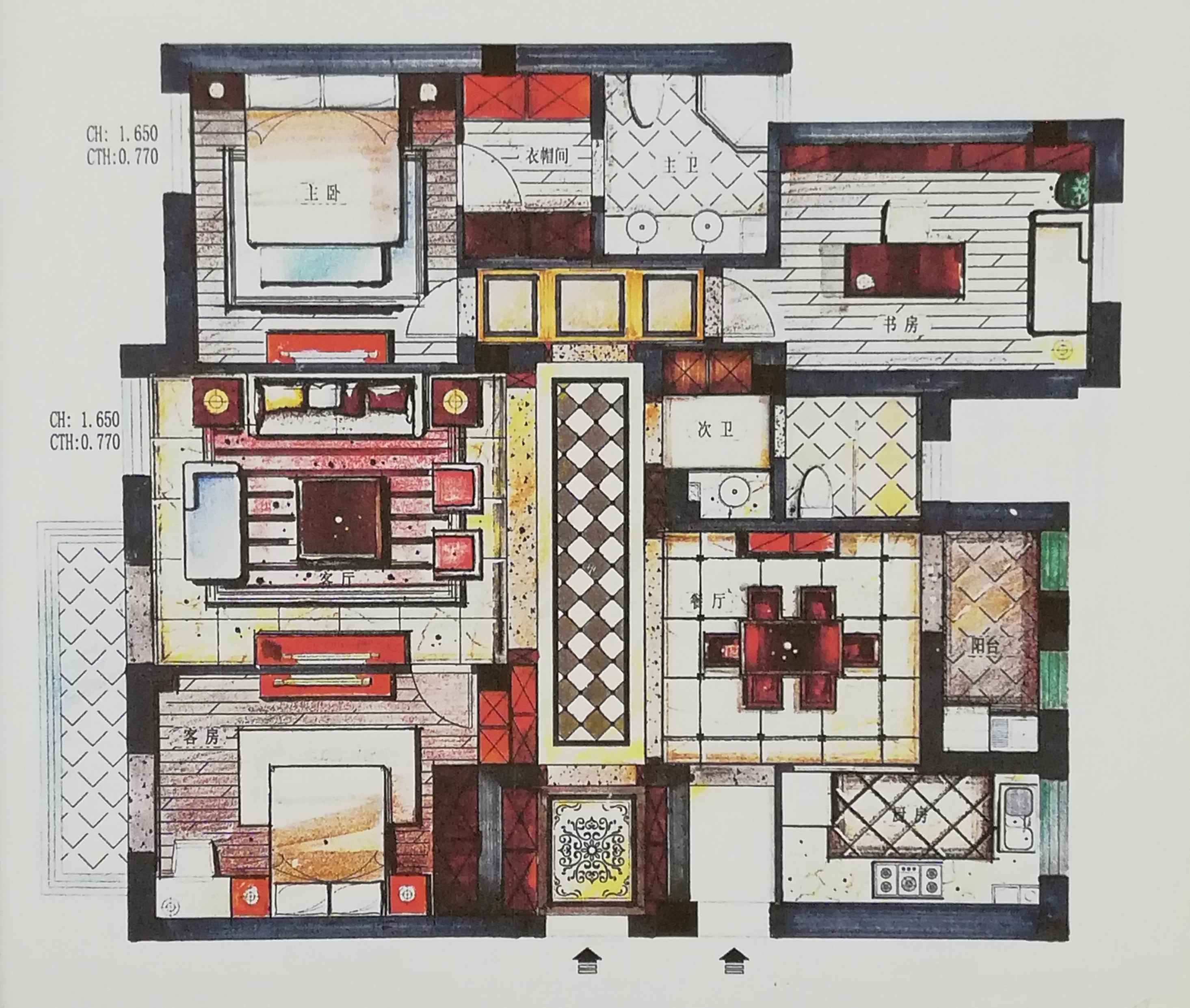 俗话说:看设计,看平面。平面做好了,设计就成功了一半。这说明有一个好的平面图至关重要。这是一个感性与理性相结合的过程,不仅需要艺术的激情,还要有科学的头脑。在平面布局时,要兼顾功能和形式。首先要考虑功能,这也是前一步调查与分析的逻辑结果。在此阶段必须要有尺度的概念,人的尺寸和使用方式决定家具的尺寸和空间尺度。勒·柯布西耶就非常重视人体尺寸,他提出根据黄金比例制定人的“模度”观点,也印证了他曾说过的“我的建筑空间都是适合人体尺寸的”。需要提醒考生的是必须时刻牢记人体尺寸,所设计的家具和空间要满足使用条件。另外不同使用功能和性质的室内环境,对室内设计的风格特点要求也各有不同。