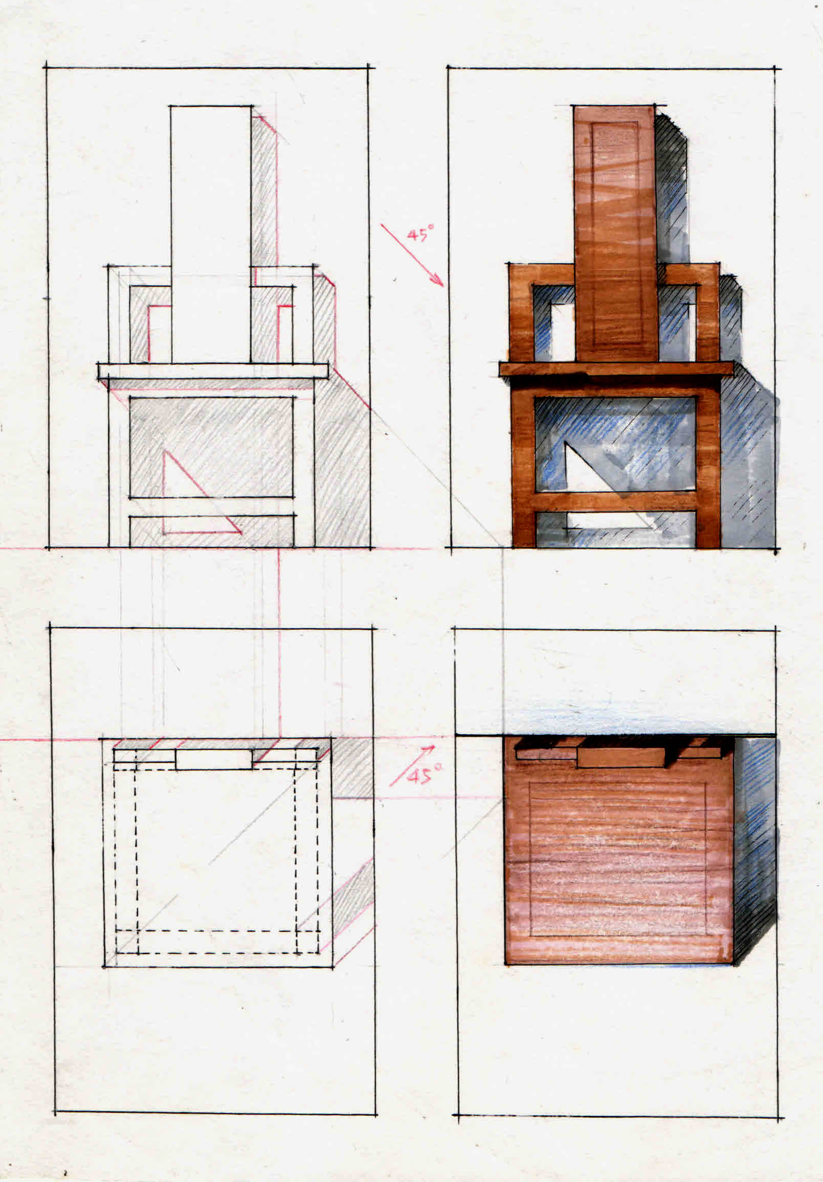 (1)实测一张椅子,制作三视图,并绘制成正投影效果图;
