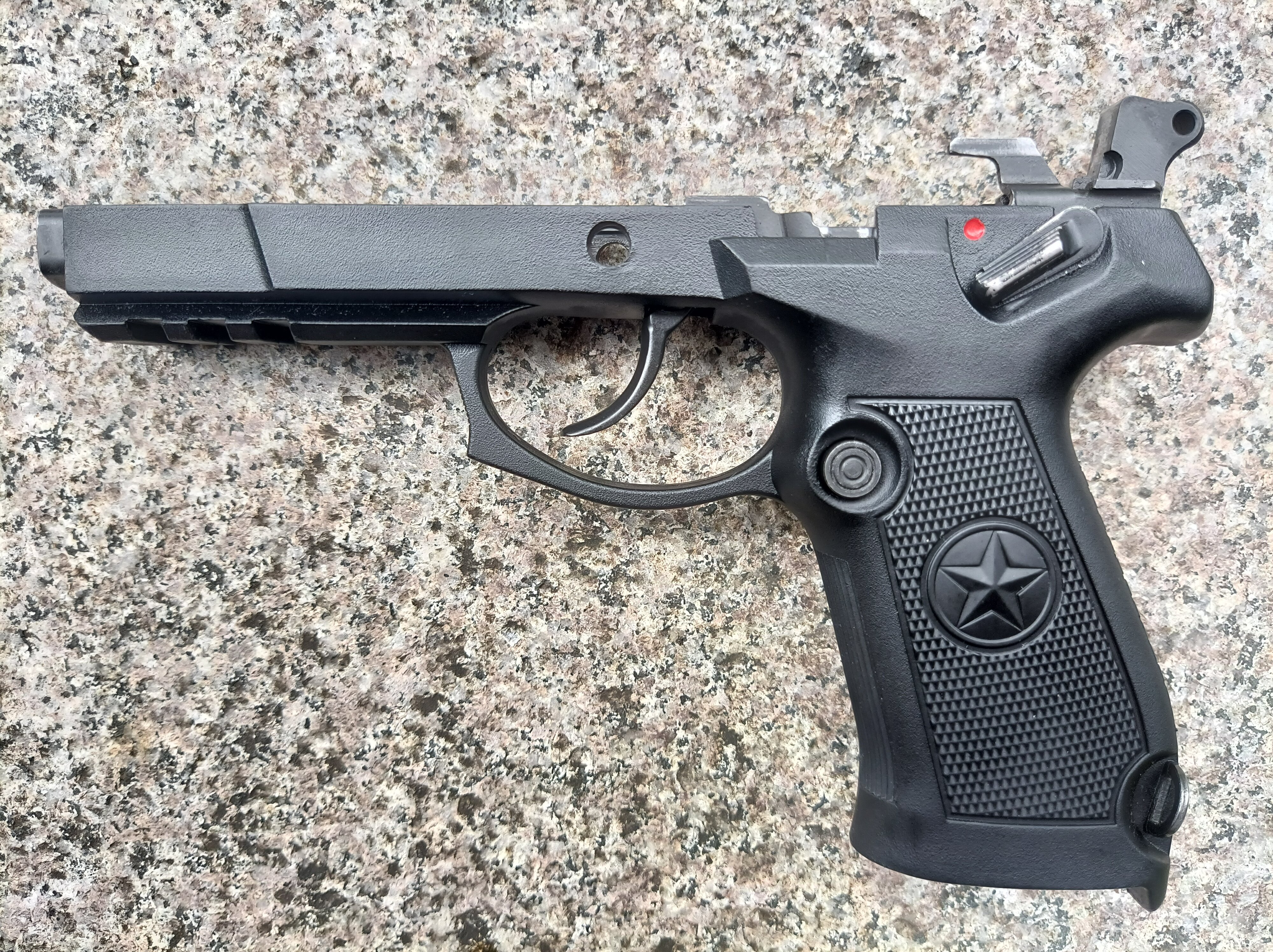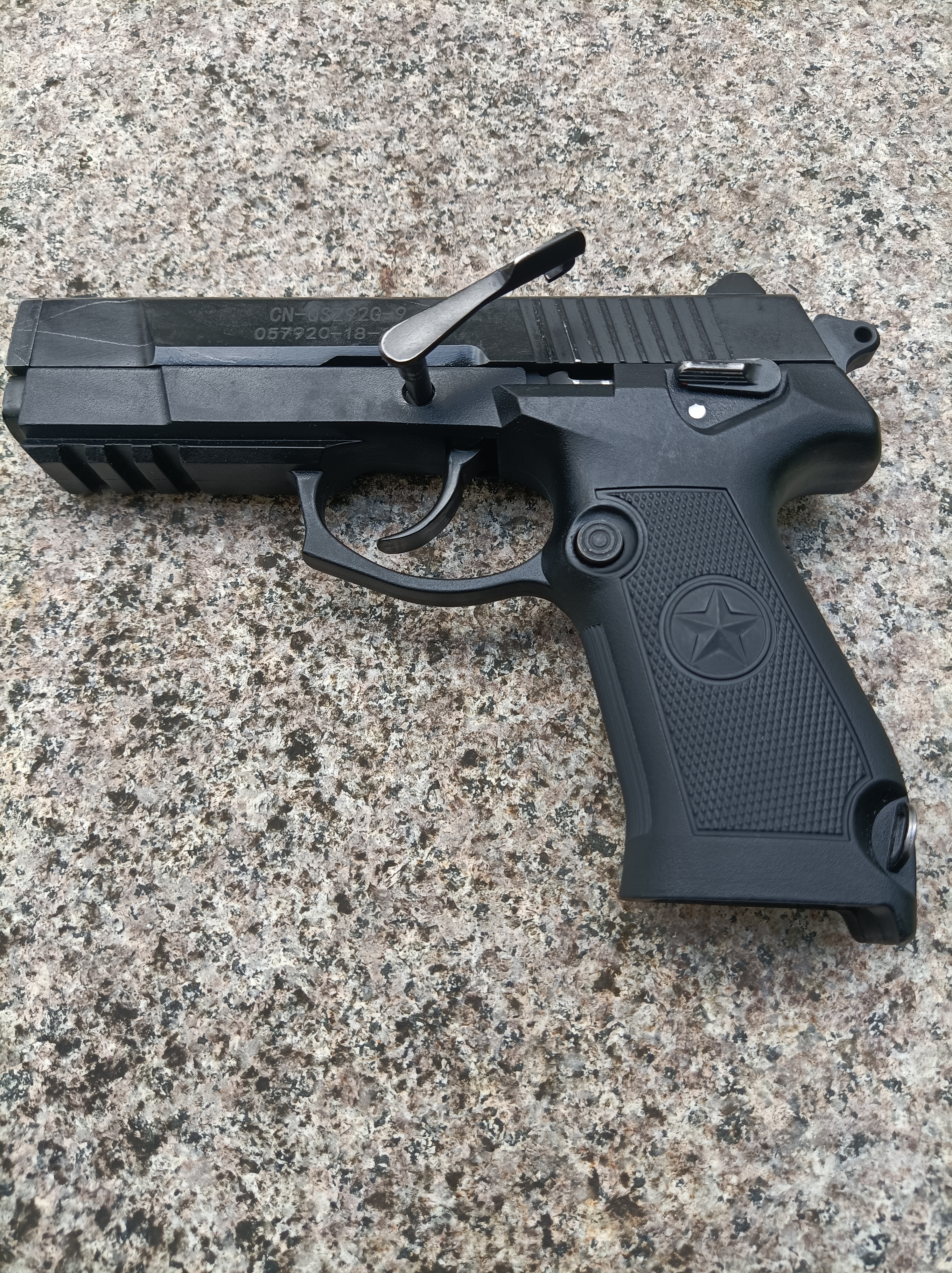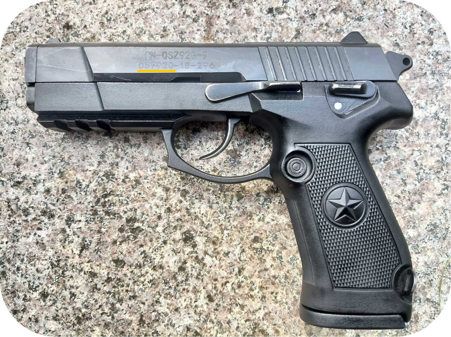 QSZ92G式9mm手枪简称92G(改)手枪,配备DAP92式9mm普通弹、DAP92A式9mm普通弹、仿9*19mm巴拉贝鲁姆手枪弹,主要用于杀伤50m以内的有生目标。(下图)