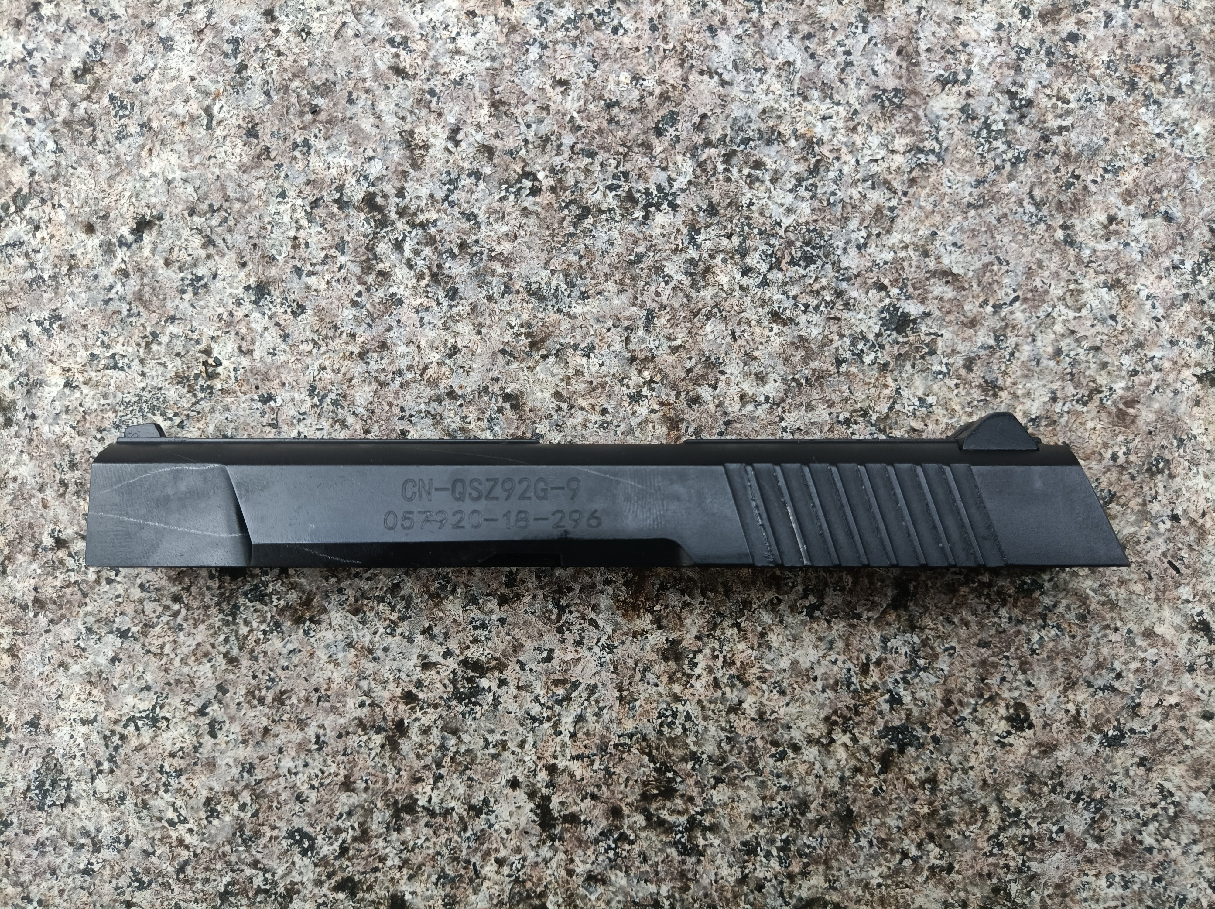 套筒(枪机)左侧:国家代码(CN)、产品代码(QSZ92G-9)、枪号(由六位数字组成)、生产年份(18)、工厂代号(296)