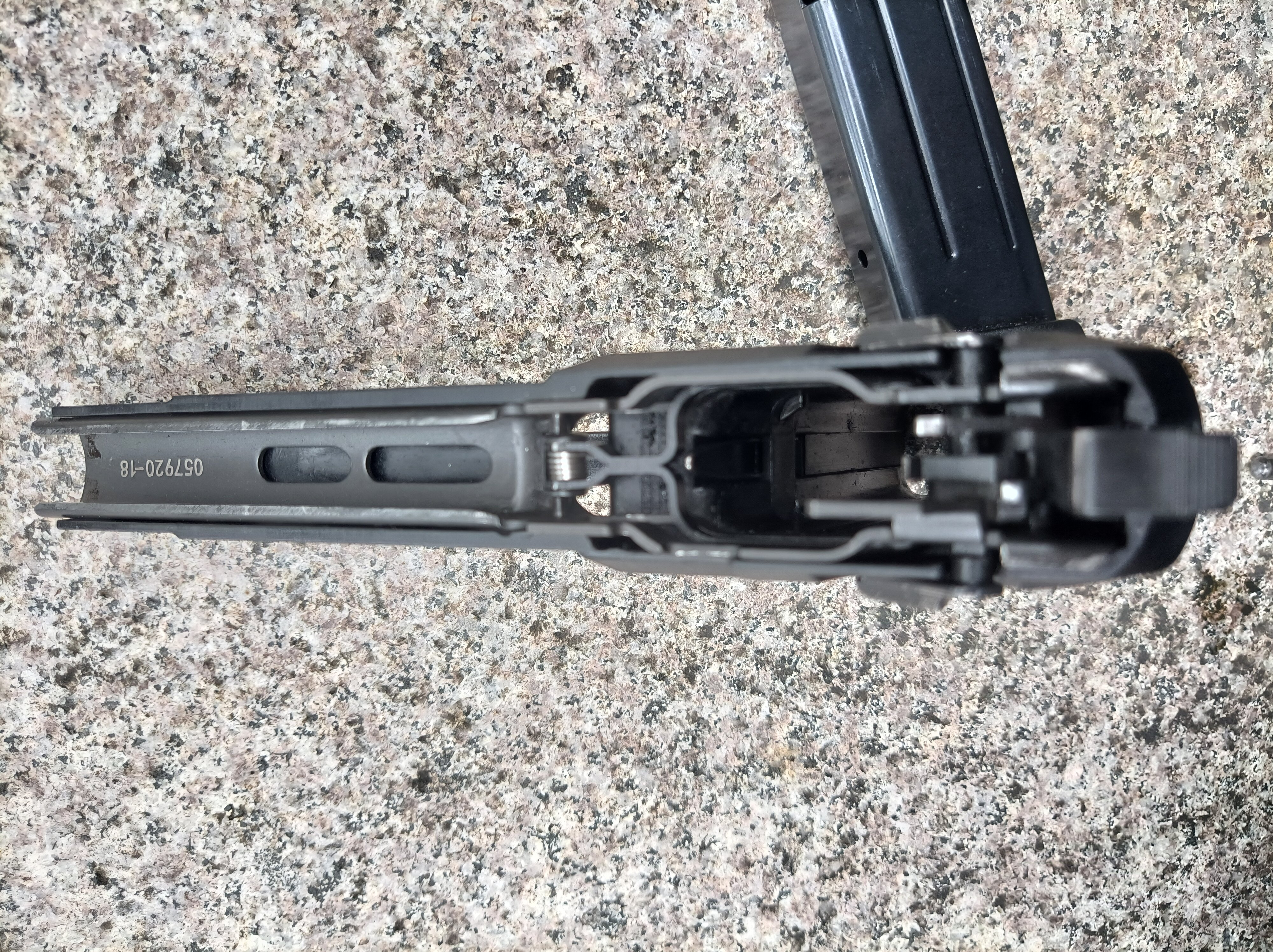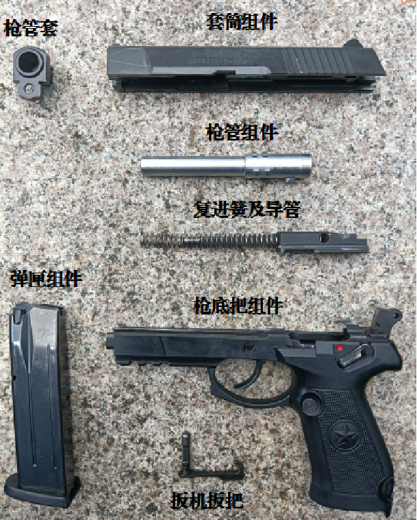 该枪由枪管套、套筒组件、枪管组件、复进簧及导管、枪底把组件、弹匣组件、挂机扳把等零部件组成。