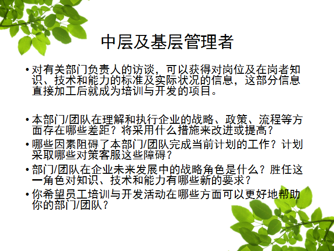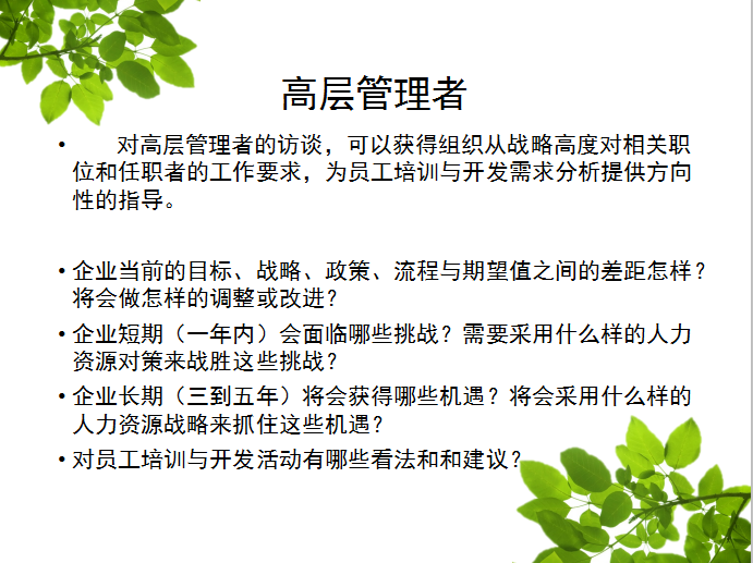 对高层管理者的访谈,可以获得组织从战略高度对相关职位和任职者的工作要求,为员工培训与开发需求分析提供方向性的指导。