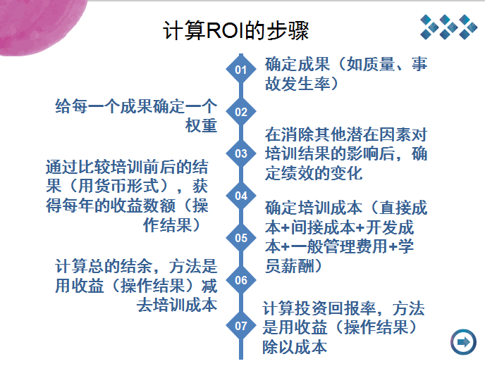 第五层次,培训固然会对组织产生积极的影响,但是同样需要比较对培训的投入以及通过培训对组织产生的收益。