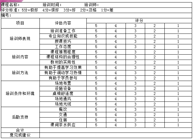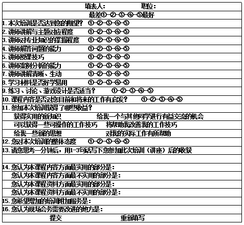 反应层面的评估目的在于考察学员对培训活动的满意度,在大多数情况下,是向学员发放一份“培训评估表”,借以收集学员对培训师、培训内容、培训方式方法、培训条件和环境以及培训管理各方面的主观感受。