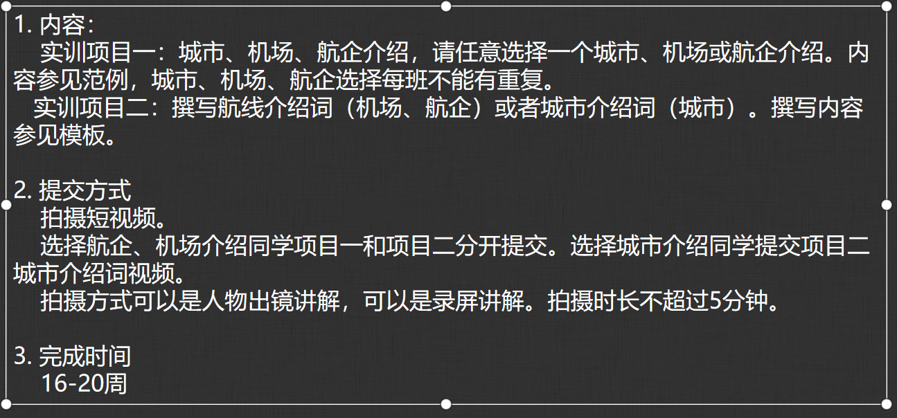 你们好!这一节主要实训内容是介绍机场、航空公司或空城城市。 具体要求如下: