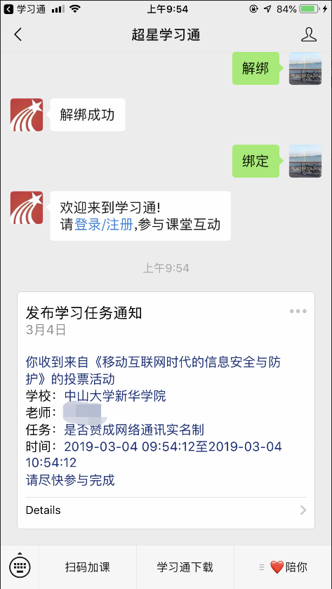 学生成功在微信上绑定账号后,教师发布签到,投票,选人,抢答,主题讨论等互动操作,学生可在微信中完成操作。