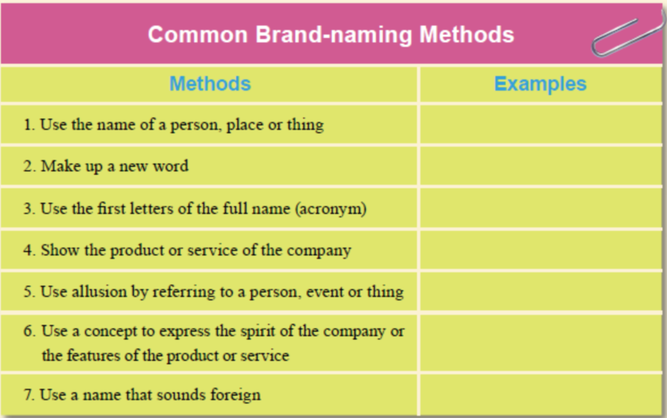 Task Work in pairs. In the table there are some commonly used methods to name a company or brand. Examples of some famous companies or brands are listed below. Discuss with your partner and match the examples with the corresponding methods.