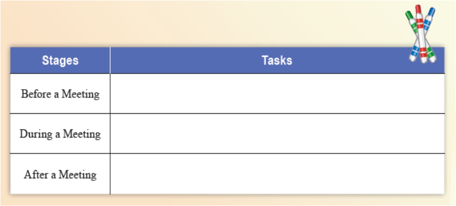 Task Work in pairs. Read the following list of the tasks at different stages of a business meeting. Discuss with your partner and match each task with its corresponding stage.