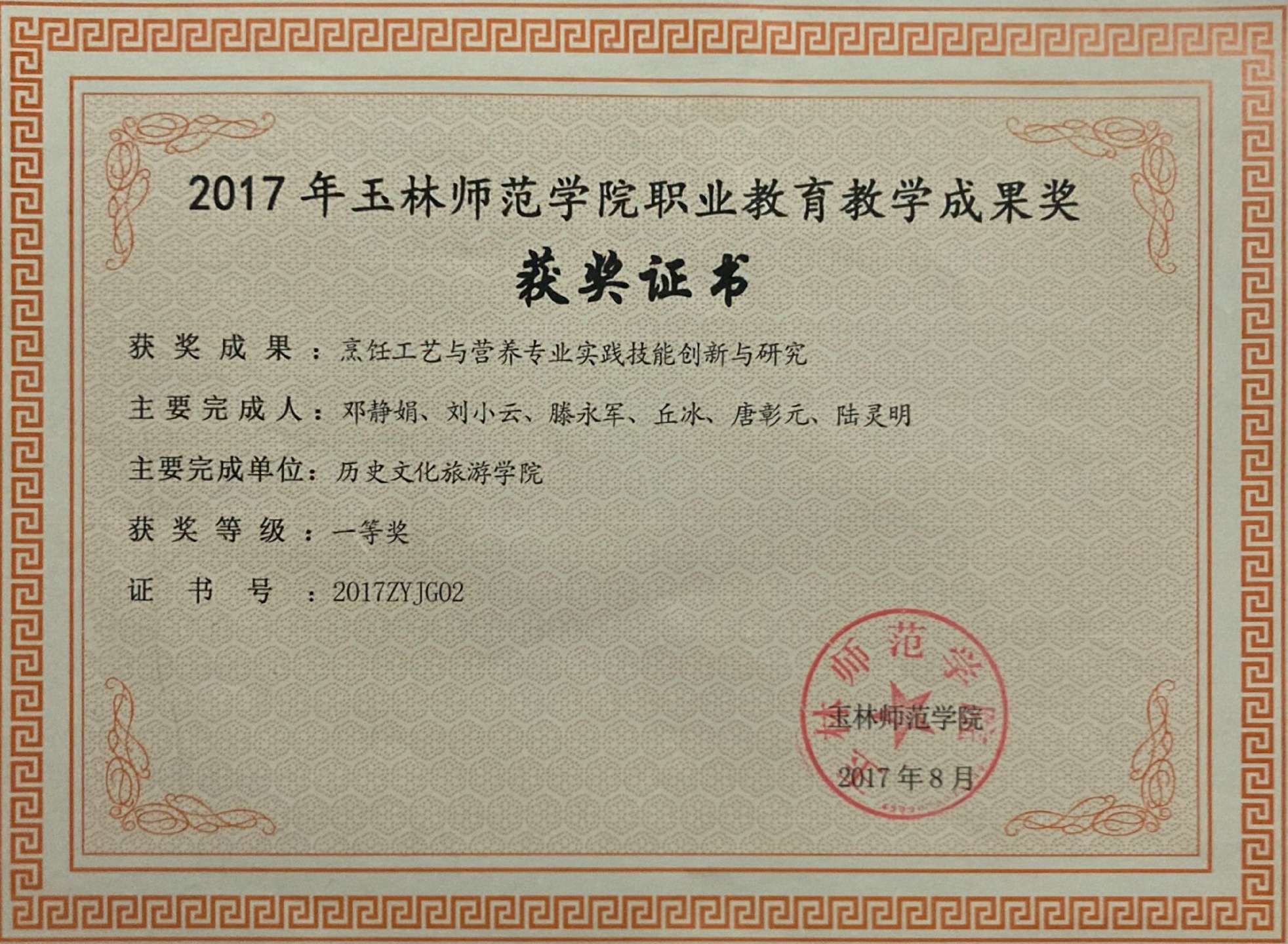 任教以来,在烹饪教研室坚持进行烹饪工艺与营养专业技能创新与研究,把课程中的理论知识带到实践中去,再从实践中把示范的作品做成微课反馈于教学,运用多媒体与视频的方式,把微课运用到课程中,学生都在中西面点师证、中级厨师证、高级营养师等考证上成绩显著,在学生中反馈良好。不少学生还在中职学校、五星级大酒店应聘上专业教师和专业面点师、厨师等岗位。