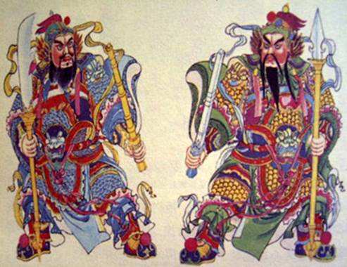 唐太宗李世民在成就帝业期间,杀伐太多,有一段时间晚上常做噩梦,听到卧室外边鬼魅呼叫,抛砖掷瓦,夜夜不得安生。唐太宗将此事告诉群臣。大将秦琼说:“臣戎马一生,杀敌如切瓜,收尸如聚蚁,何惧鬼魅?臣愿同敬德披坚执锐,把守宫门”。李世民欣然同意,当夜由二位大将把守宫门,他一觉睡到天明。虽然李世民不做噩梦了,但两位大将每天彻夜把守实在辛苦,李世民吩咐画师,绘制二位将军的真容贴到门上。以画代人,倒也顶事,邪祟自息。于是民间沿袭此法避邪驱鬼,秦叔宝和尉迟敬德就成了门神。
