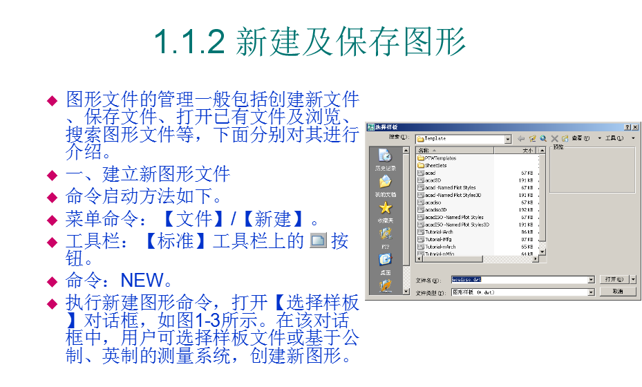 AutoCAD中有许多标准的样板文件,它们都保存在AutoCAD安装目录中的“Template”文件夹里,扩展名为“.dwt”。用户也可根据需要建立自己的标准样板。