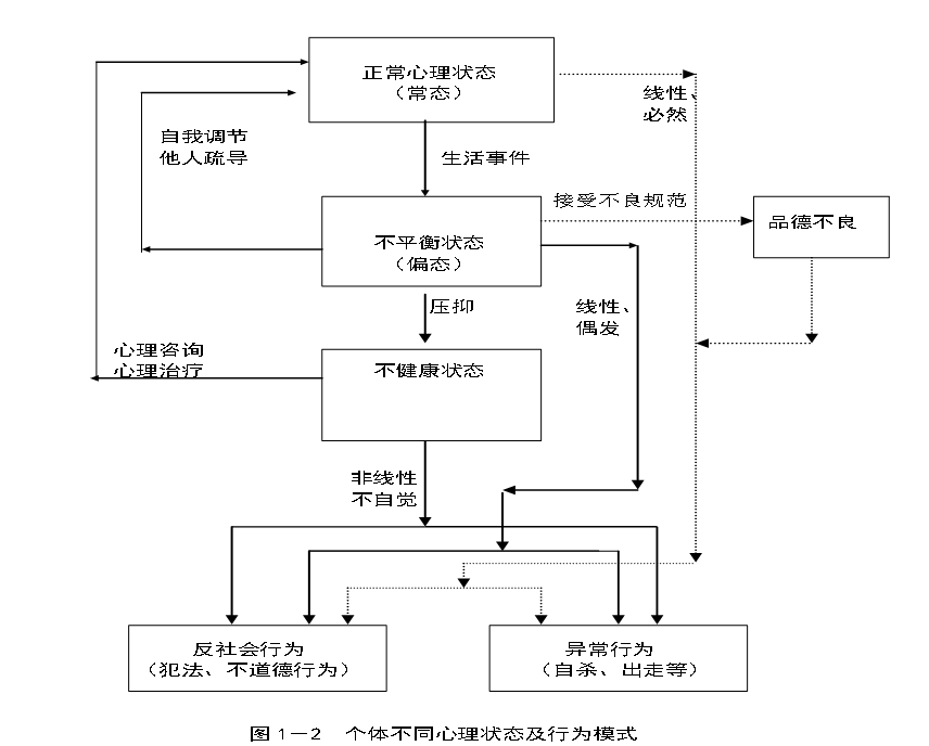 从心理健康的角度来看,人们心理状态可以分为三种情况或状态:正常状态(常态)、不平衡状态(偏态)与不健康状态或病态(变态),与这三种心态相应,其不适应行为表现出不同的特点。