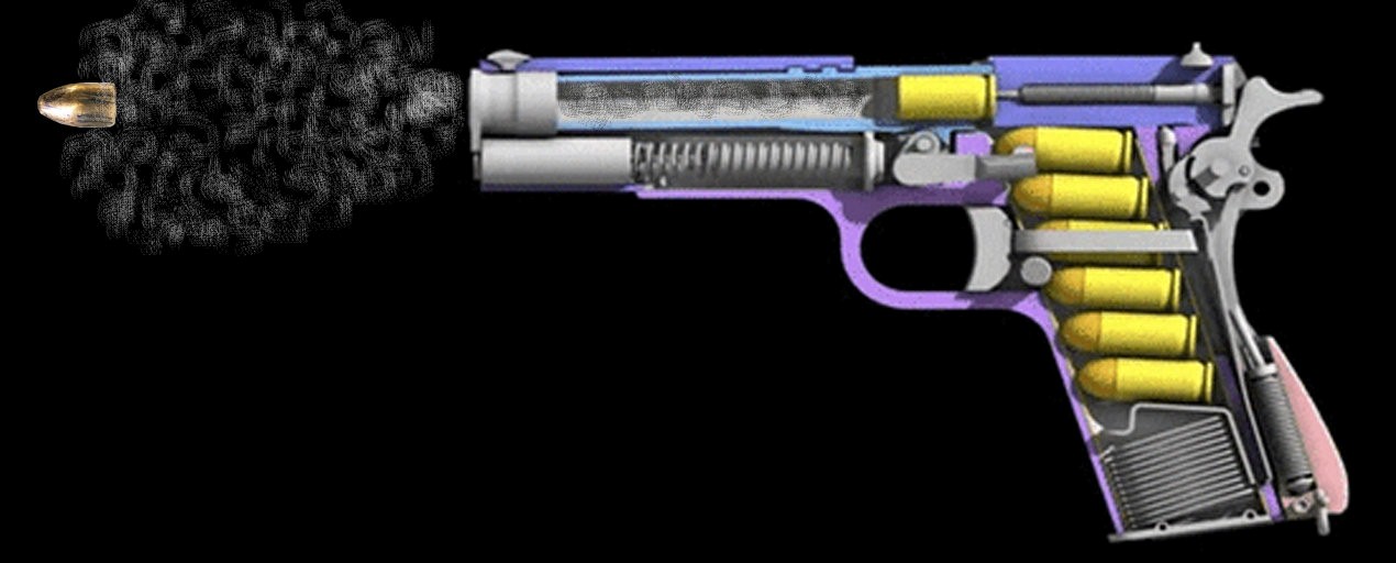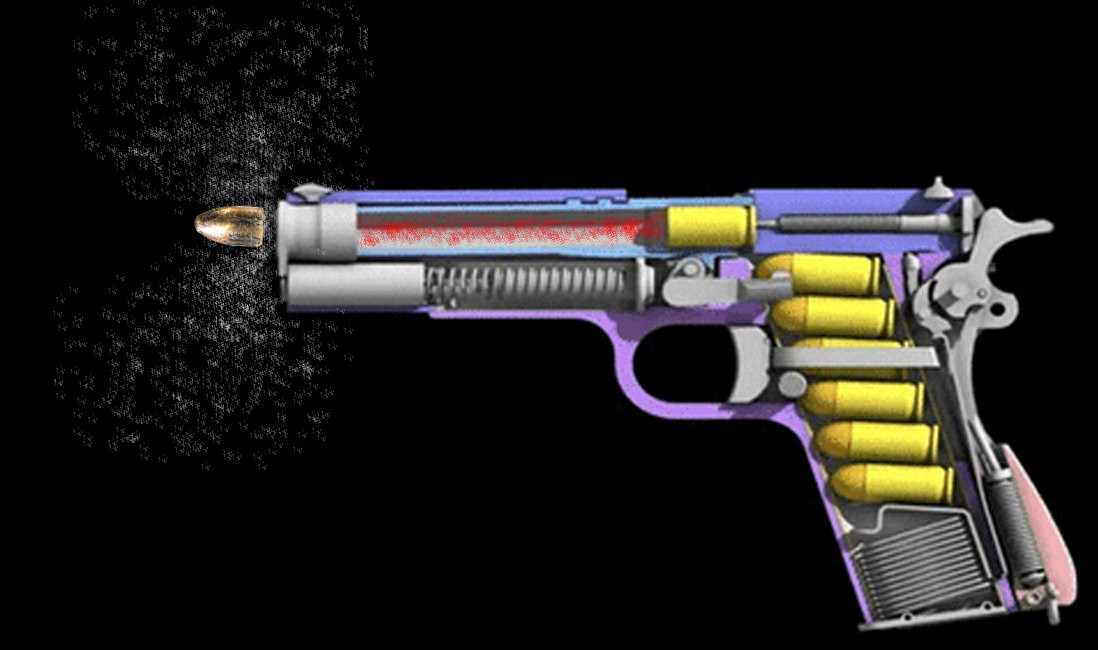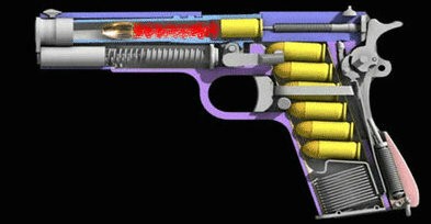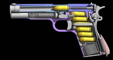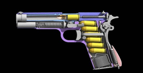 击针撞击子弹底火,使起爆药发火,火焰通过导火孔引燃发射药,产生大量火药气体,在弹壳内形成很大的压力,迫使弹头脱离弹壳,沿膛线旋转加速前进,直至推出枪口。