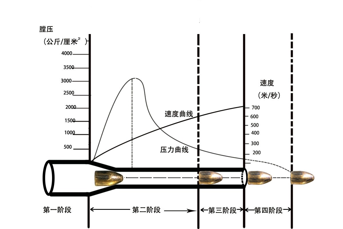 第二阶段:基本阶段(图5-2-3)。自弹头开始运动起到发射药燃烧完为止。此阶段发射药迅速变化且在容积内燃烧,膛内压力随气体的增加迅速加大,弹头运动速度随之加快。当弹头在膛内前进6厘米~8厘米时,膛内的压力最大,此压力称为最大膛压。各种枪的最大膛压为1400公斤/厘米2-3000公斤/厘米2不等。