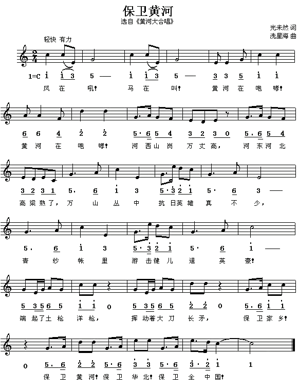 抗战期间,1939年光未然坠马后到延安养伤,根据多次渡黄河行军作战的经历,5天写成组诗《黄河》。冼星海读过诗很感动,仅用6天时间谱完全部曲调。