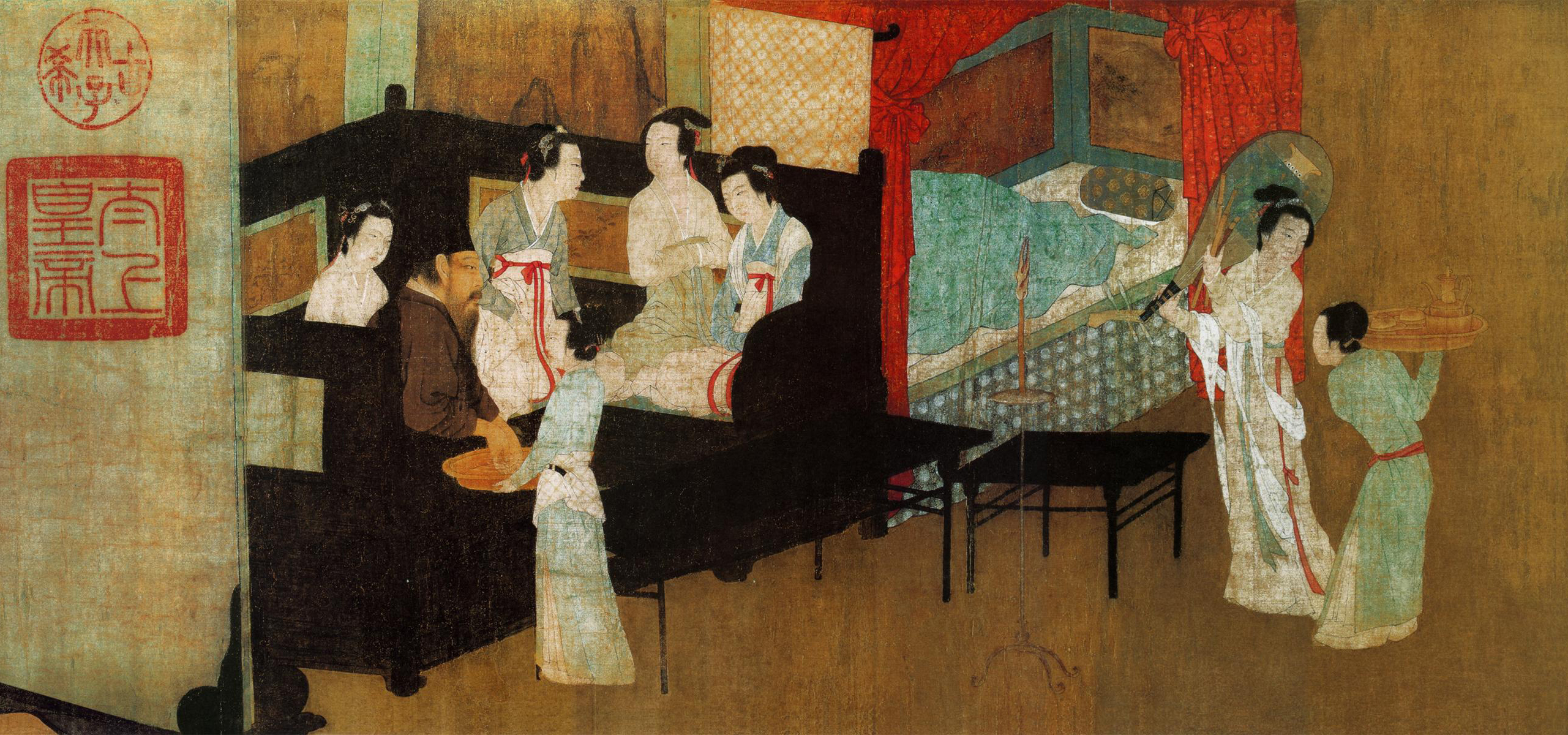 第三段描绘的是宴会进行中间的休息场面,人物安排相对松散。韩熙载在妻妾们的簇拥下躺在内室的卧榻上,一边洗手,一边和侍女们交谈着,也是整个画卷所表现的夜宴情节的一个间歇,整体气氛舒缓放松。