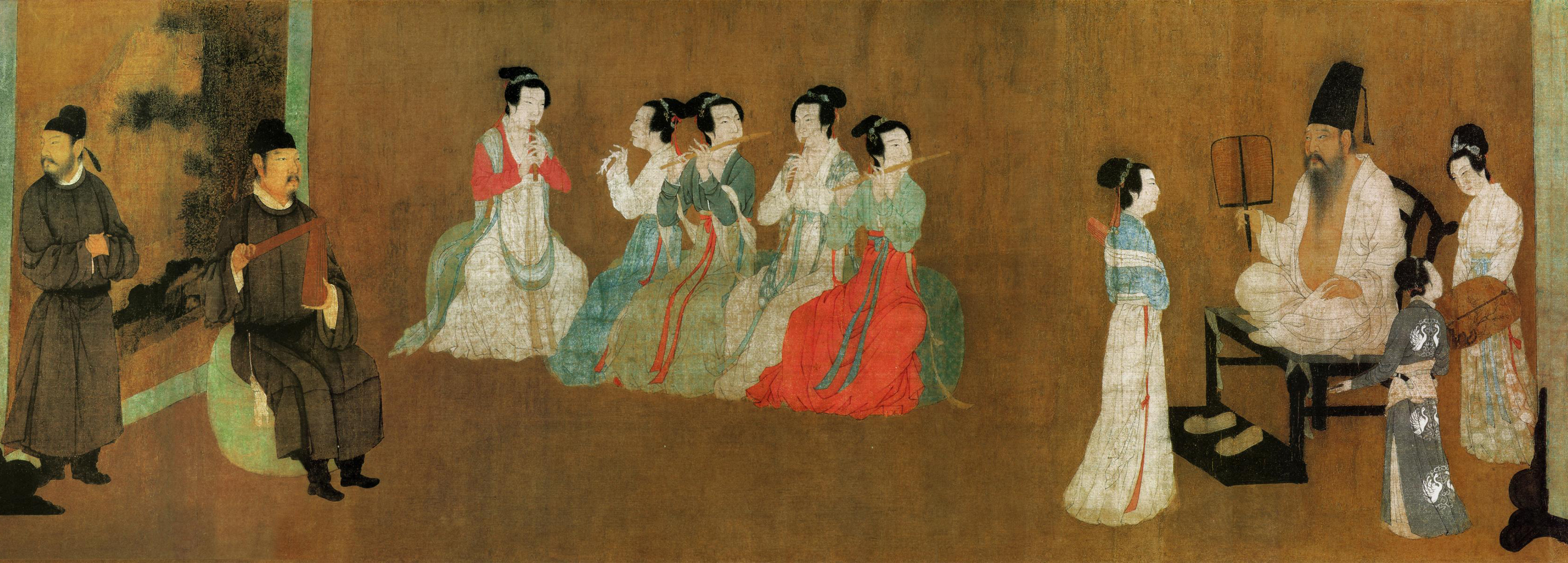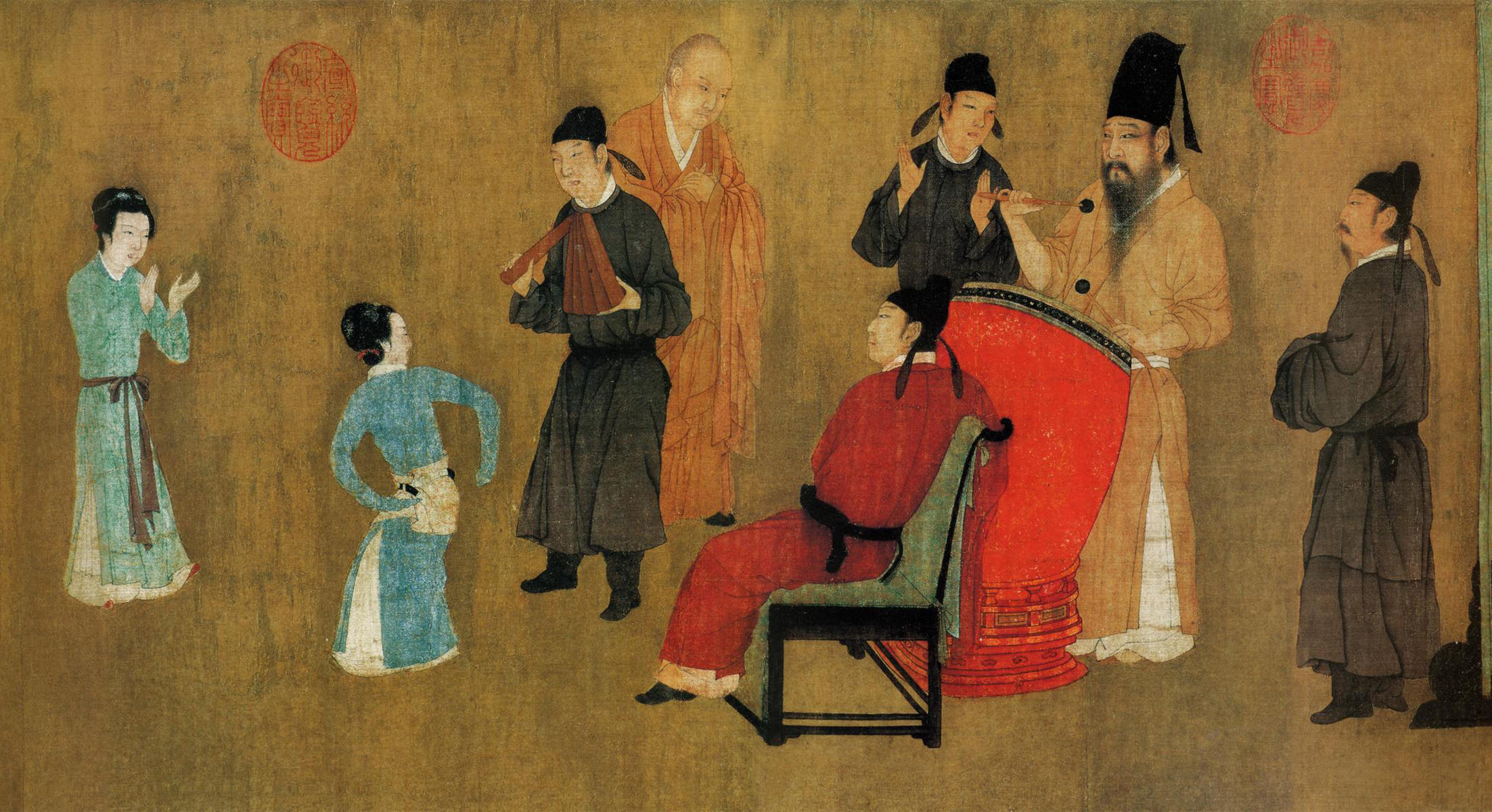 第一段“听乐”描绘了韩熙载与宾客们正在聆听弹奏琵琶的情景,画家着重地表现演奏刚开始,全场气氛凝注的一刹那。画上每一个人物的精神和视线,都集中到了琵琶女的手上,结构紧凑,人物集中。但人们敛声屏气的神情中使场面显得十分宁静,从这弹奏琵琶的手上,似乎传出了美妙清脆的音符,而这音符震动着观众的耳膜,勾摄了他们的内心情感。画家对于不同的人物,根据他们不同的身份和年龄,刻划出他们各自不同的姿态、性格和表情,显示出作者不同凡响的画艺。
