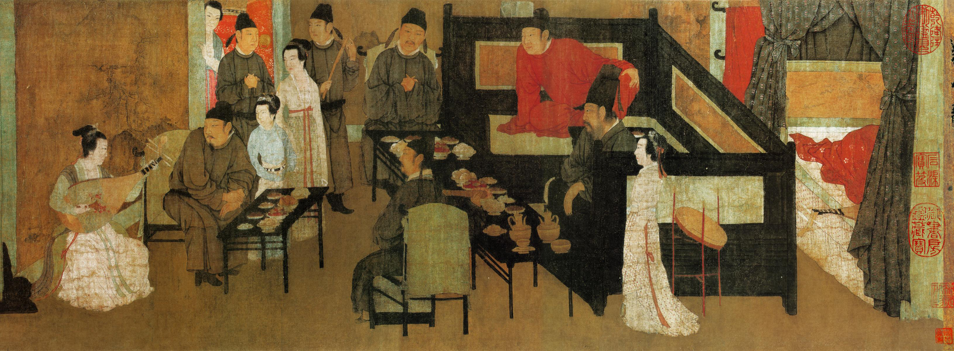 全图以五个既联系、又相对独立的画面,描绘了南唐中书舍人韩熙载夜晚宴请宾客时的听乐、赏舞、休息、清吹、散宴等情景。人物形象准确、生动,对韩熙载的复杂神态刻画尤为传神。作品用笔劲健、流畅,色彩浓丽、典雅,各种器具及服饰花纹等描绘精微工整。