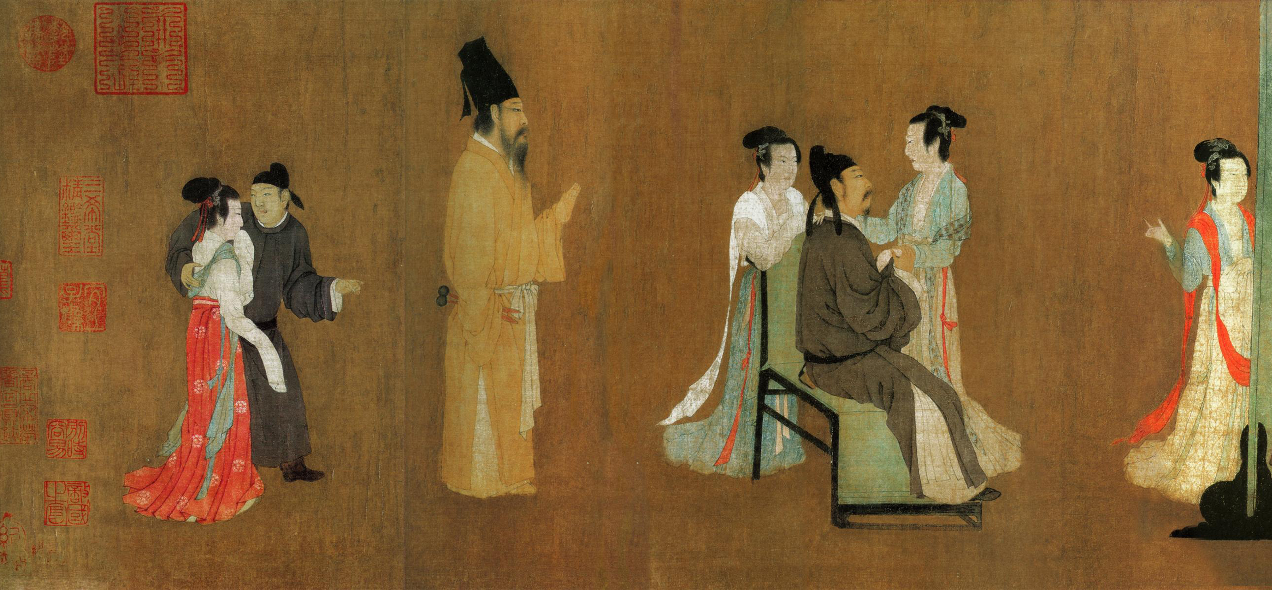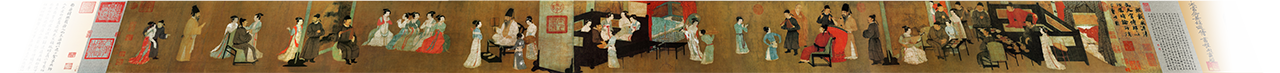 画面描绘宴会结束,宾客们有的离去,有的依依不舍地与女伎们谈心调笑的情状,结束了整个画面。完整的一幅画卷交织着热烈而冷清、缠绵又沉郁的氛围,在醉生梦死的及时行乐中,隐含着韩熙载对生活的失望,而这种心情,反过来又加强了对生活的执着和向往。