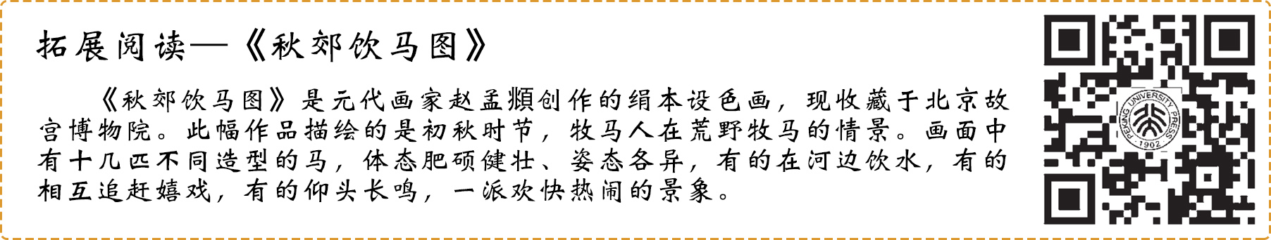 2.经典艺术作品一定具有艺术独创性,独一无二,不可重复,体现出艺术家本人独特的审美追求与艺术表现。如唐代画家韩干笔下的马与元代画家赵孟頫笔下的马完全不同。(韩干名画《照夜白图》,杜甫批评“干惟画肉不画骨”。) 又如20世纪20年代两位散文名家朱自清和俞平伯同游之后,各自写了一篇同名散文《桨声灯影里的秦淮河》。