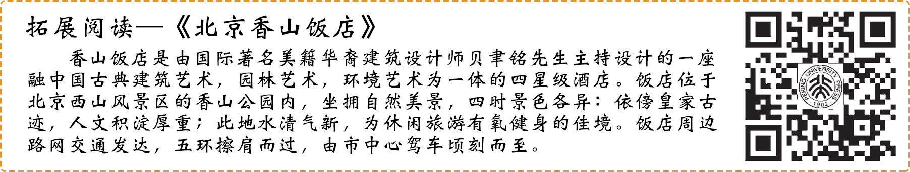 比如说贝聿铭先生设计的北京香山饭店,它的建筑语言非常现代,白色的外观,白色的围墙,这在北京几乎没有。中国的北方从来不用白颜色作为外墙和外观,只有南方才是这样的,比如徽派建筑是白色的外墙。开始我们都不能理解,直到有一年秋天,去香山开会,走到香山还没有进宾馆的时候,我一下子领悟了贝聿铭这位大师为什么要把它设计成白色的外观。因为十月的秋天北京最好的季节,整个香山的枫叶都红了,“漫山红遍,层林尽染”。这个时候香山饭店的白色在里面非常协调,换其他任何一个颜色都不行,只有这个白色。我这才突然领悟到,大师设计的时候已经想到要把香山饭店与整个香山火红的枫叶融为一体,这就是现在国际上最流行的环境艺术,或者叫有机建筑。