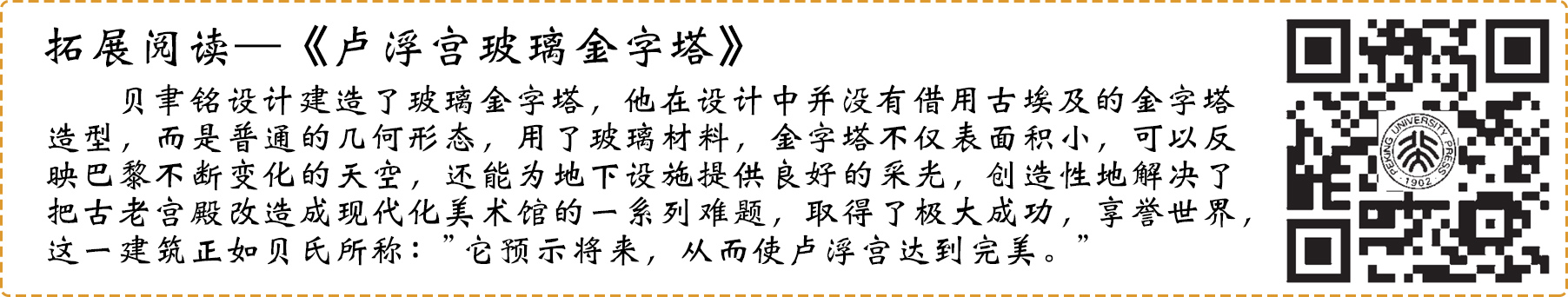 贝聿铭先生的另一作品是法国罗浮宫前像金字塔的罩子。大家都知道,人类现在流传下来最古老的建筑就是埃及的金字塔,距今好几千年,而罗浮宫是最古老的博物馆,贝聿铭先生将最古老的建筑和最古老的博物馆结合在一起,设计了一个玻璃金字塔。贝聿铭先生已经90来岁了,他自己宣布不再从事建筑设计。但是当他的家乡,苏州市政府找到他,请他为家乡设计一个博物馆的时候,他欣然应允,设计了他晚年的一个建筑作品——苏州博物馆。苏州博物馆同样是用现代的建筑语言体现中国优秀的传统文化。它的大门,体现西方流行的美学,是一种简洁的美。关于这一点,我们现在很多人把家庭装修得非常豪华,搞得像个酒吧间一样,这其实早就过时了。以前那种洛可可的风格早已不流行,现在流行简洁美。苏州博物馆大量使用徽派建筑黑白相间的风格,同时他把苏州园林的元素全部用进来,博物馆内有湖水、金鱼,还有亭台楼阁等。可见贝聿铭先生也是用现代的建筑语言体现中国优秀的传统文化。