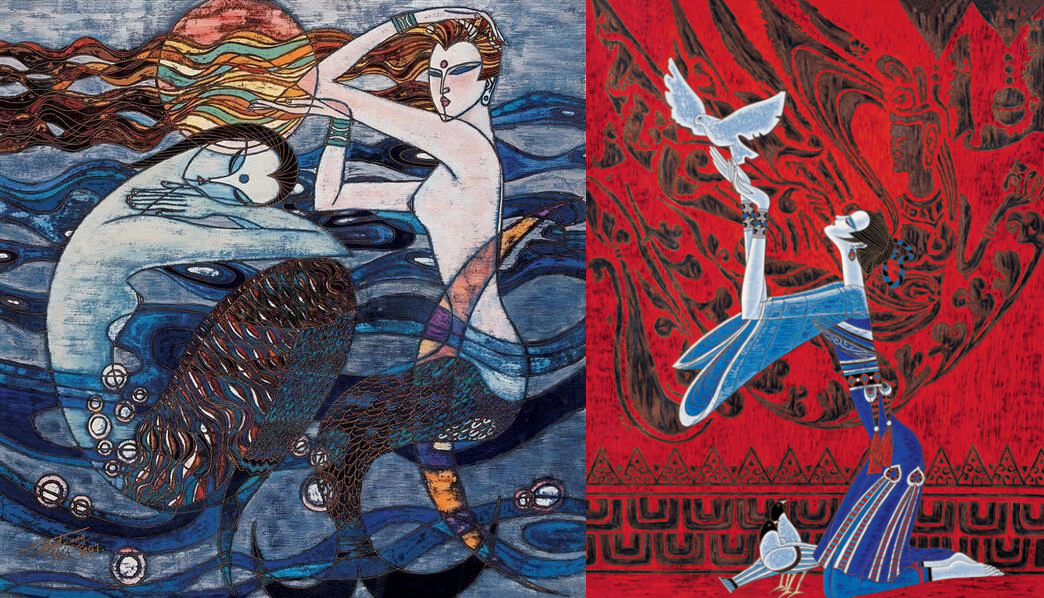丁绍光的画用我刚才概括的话就是 “用现代绘画语言来体现中国的传统文化”。比如他的代表作,1995年的《宗教与和平》,1991年的《晨》,其实画的就是云南的傣族的姑娘,傣族的文化,但是他用了现代的西方艺术语言,包括超现实主义、抽象主义、表现主义的绘画语言。比如他画的女性,身姿瘦长,我们自己的绘画语言没有这样的。还有1987年的《美人鱼》画的也是傣族的风情,绘画语言非常现代,不像中国画家画的,但西方人非常容易接受,因为现代主义的绘画对西方影响非常大。
