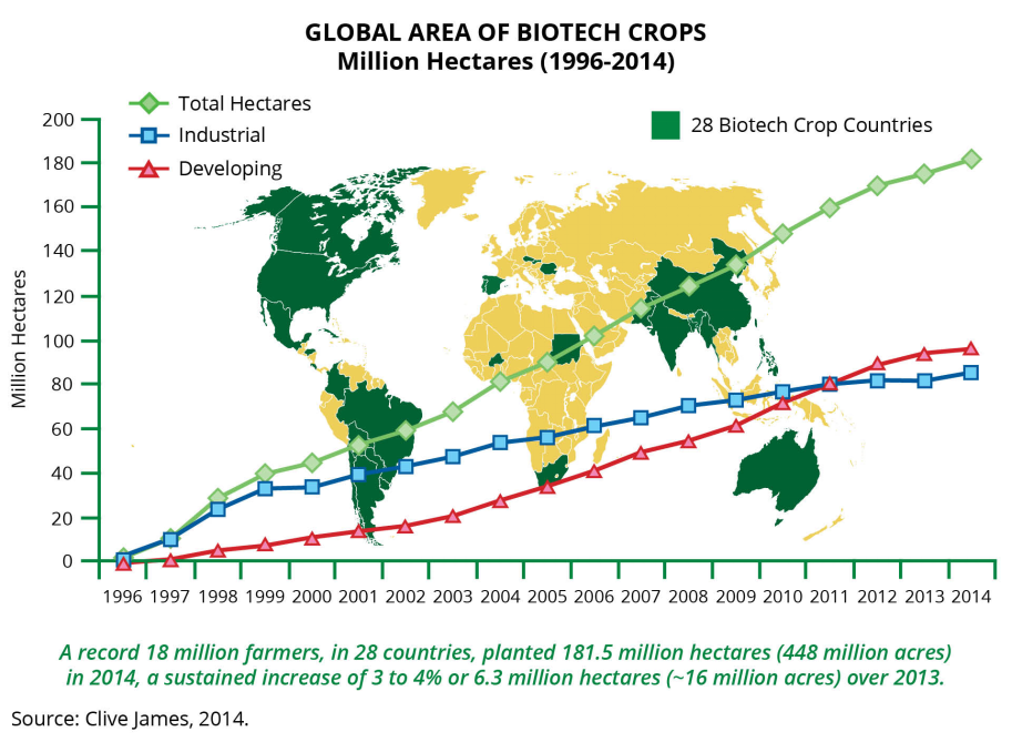 2014年,28个国家的1800万农民种植了1.815亿公顷(4.48亿英亩)的转基因作物,比2013年持续增长了3%-4%,即630万公顷(1600万英亩)。
