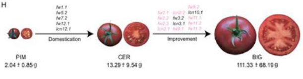驯化和改良中各选一个果实,结果发现驯化改良选择区域影响杂种优势利用,基因组绘制了番茄育种的基因组简史。