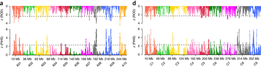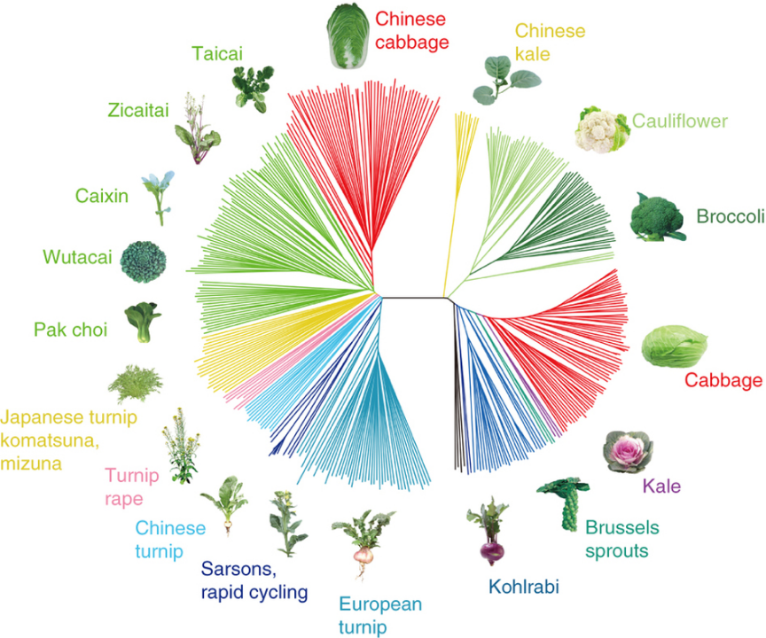 最近(Nature Genetics 48, 1218-1224),我国科学家利用甘蓝(Brassica oleracea)和芜菁(Brassica rapa)基因组序列,分析了同源基因中6,707 SNP位点,构建了芸薹属中主要蔬菜种类的系统发生树,明确了其亲缘关系