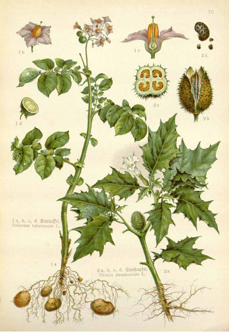 马铃薯(Solanum tuberosum)名字的由来则是因为它类似番茄的紫黑色浆果,大小和圆度都像马胸前挂着的铃铛。 高原生长的野生马铃薯矮小茂密,每年初夏开出淡紫色的花朵。