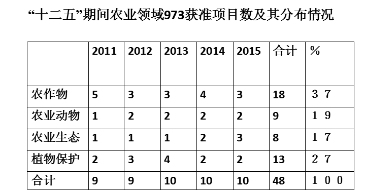 “十二五”计划实施以来,5年共启动了48个各类项目,其中农作物方面18项,占37% ;农业动物9项,占19%;农业生态8项,占17%;植物保护13项,占27%。获准项目计划投入经费总数15.0155亿元。其中农作物方面5.9879亿元,占39.9% ;农业动物2.6733亿元,占17.8%;农业生态2.2245亿元,占14.8%;植物保护4.1298亿元,占27.5%。