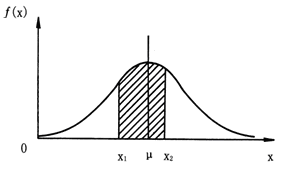正态分布密度曲线和横轴围成的一个区域,其面积为1,这实际上表明了“随机变量x取值在-∞与+∞之间”是一个必然事件,其概率为1。若随机变量x服从正态分布N(μ,σ2),则x的取值落在任意区间[x1,x2)的概率,记作P(x1≤x<x2),等于图3-6中阴影部分曲边梯形面积。即: