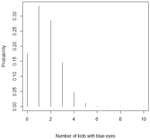 因此,给定p = 0.16,10个蓝眼睛孩子中0的概率为0.175;一个蓝眼睛孩子的概率是0.333等等。