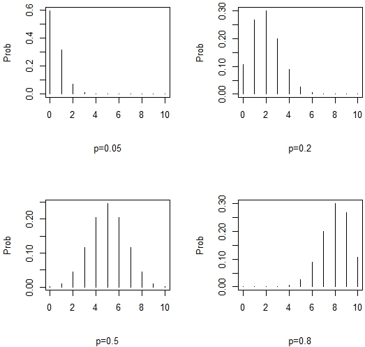 >plot(0:10,dbinom(0:10,10,0.05),type='h',xlab="",ylab="Prob",sub="p=0.05")