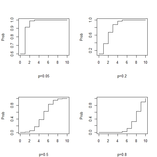 >plot(0:10,pbinom(0:10,10,0.05),type='s',xlab="",ylab="Prob",sub="p=0.05")
