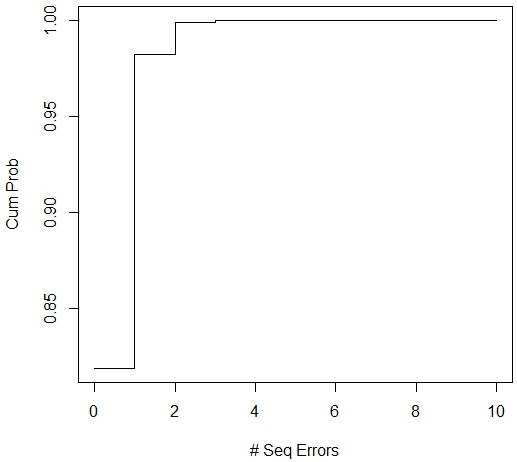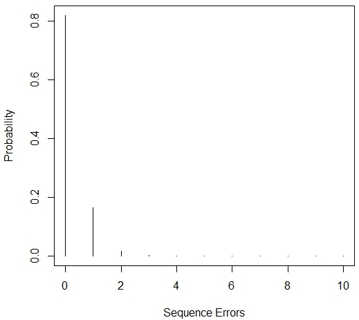 从图4-7中的CDF图中可以清楚地看出,序列错误的数量在2000个碱基对序列中使用这种方法是不太可能比3大。这个过程不会产生很多错误(除非您正在寻找更严格的可靠性)。R以下用于查找1或更小,2或更小以及3或更小的概率在这个例子中的错误。