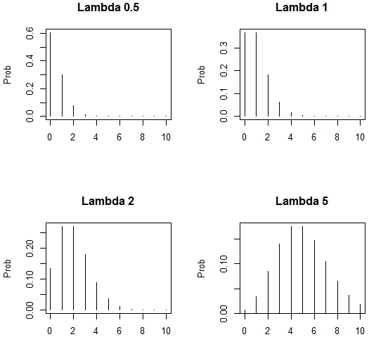 >plot(0:10,dpois(0:10,1),xlab="",ylab="Prob",type='h',main="Lambda1")