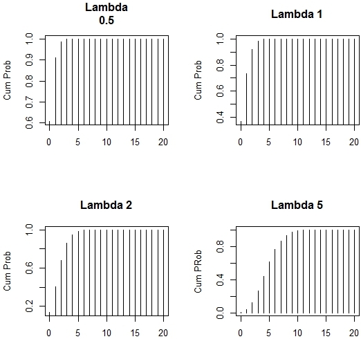 >plot(0:20,ppois(0:20,1),xlab="",ylab="Cum Prob",type='h',main="Lambda 1")