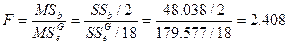 查表,F0.95(2, 18)= 3.55 > F, 所以接受