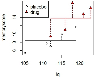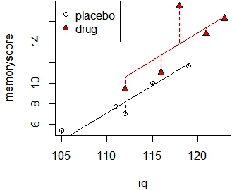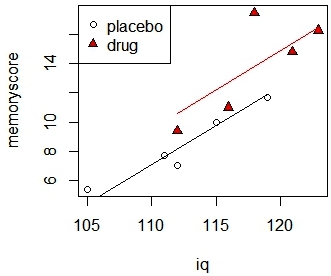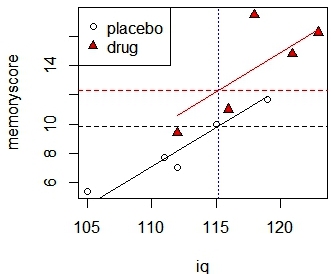 虽然ANCOVA允许你用算术调整分数来预测他们在协变量上是否相等时的情况,但如果事实上在你的实验中它们在协变量上不相等,那么它可能很难解释调整后的分数,特别是当您的实验涉及某种治疗时。例如,在我们在这里提供的关于记忆,药物与安慰剂和智商的假数据中,如果所讨论的药物对智商低的人的记忆力实际上有不同的影响,那么高智商的人会如何?要真正解决这个问题,唯一的方法就是在治疗前先将协变量的受试者等同于第一位。您也可以考虑将您的协变量转化为一个真正的因素(例如,将您的设计与智商水平交叉,例如低,中,高)。