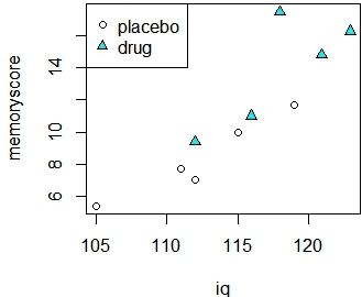 >plot(iq,memoryscore,pch=c(rep(1,5),rep(24,5)),bg=c(rep(1,5),rep(21,5)))