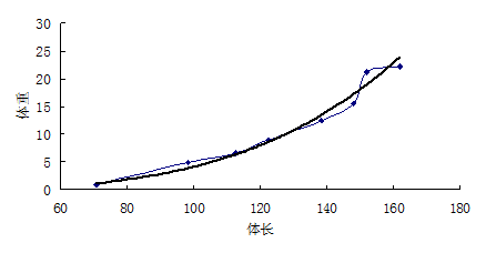 图8-2 鲟鱼体长与体重散点图及回归曲线图