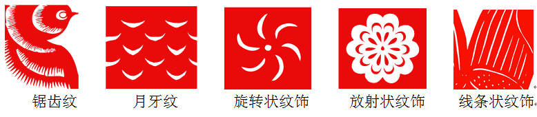 常见的剪纸纹饰有锯齿纹、月牙纹、旋转状纹饰、放射状纹饰、线条状纹饰,创作剪纸时可运用传统纹饰进行变化,形成黑、白、灰的艺术效果,以增强艺术美感。