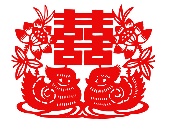 表现民俗风情题材的剪纸作品也很多,如:为了表达喜庆,新婚洞房都要贴红双喜字或带有鸳鸯形象的剪纸,以示新婚夫妇百年好合。