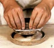 单环盘制法:把泥条盘沿着泥片旋转一周,独立成行,上一层与下层之独立成行。每做一层随时调整作品造型。做敞口造型需将上层泥条盘与下层偏外一点,依次向上盘起;收口则反之。注意变化不能太突然,以免塌落变形。
