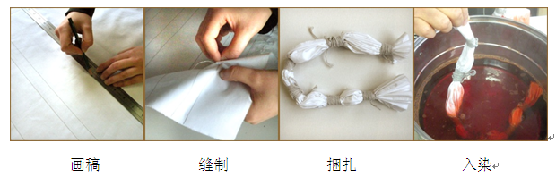 用铅笔轻轻地在布上画好设计好的图案线稿,以细线平针将图案线稿的轮廓缝好,并抽紧线绳打结固定,然后将保留白色的地方用绑绳捆扎,最后将绑好的棉布,投入到染锅里进行染色。