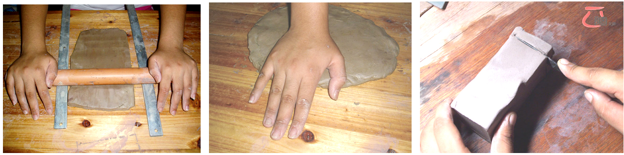 利用泥板制作陶艺,其应用范围相当广,从平面到立体,变化无穷。当泥板半干时,可用来制作一些挺直的器物,如同木工制作一样,可称之为“粘土木工”;较湿的泥板,则可用来扭曲、卷合,做成自由而柔美的造型,有些类似做裁缝;也可以利用各种模型在泥板上压出特定的形状;甚至在压制泥板的同时,也可以顺手在土板上压印下各种纹理,增加作陶的乐趣。